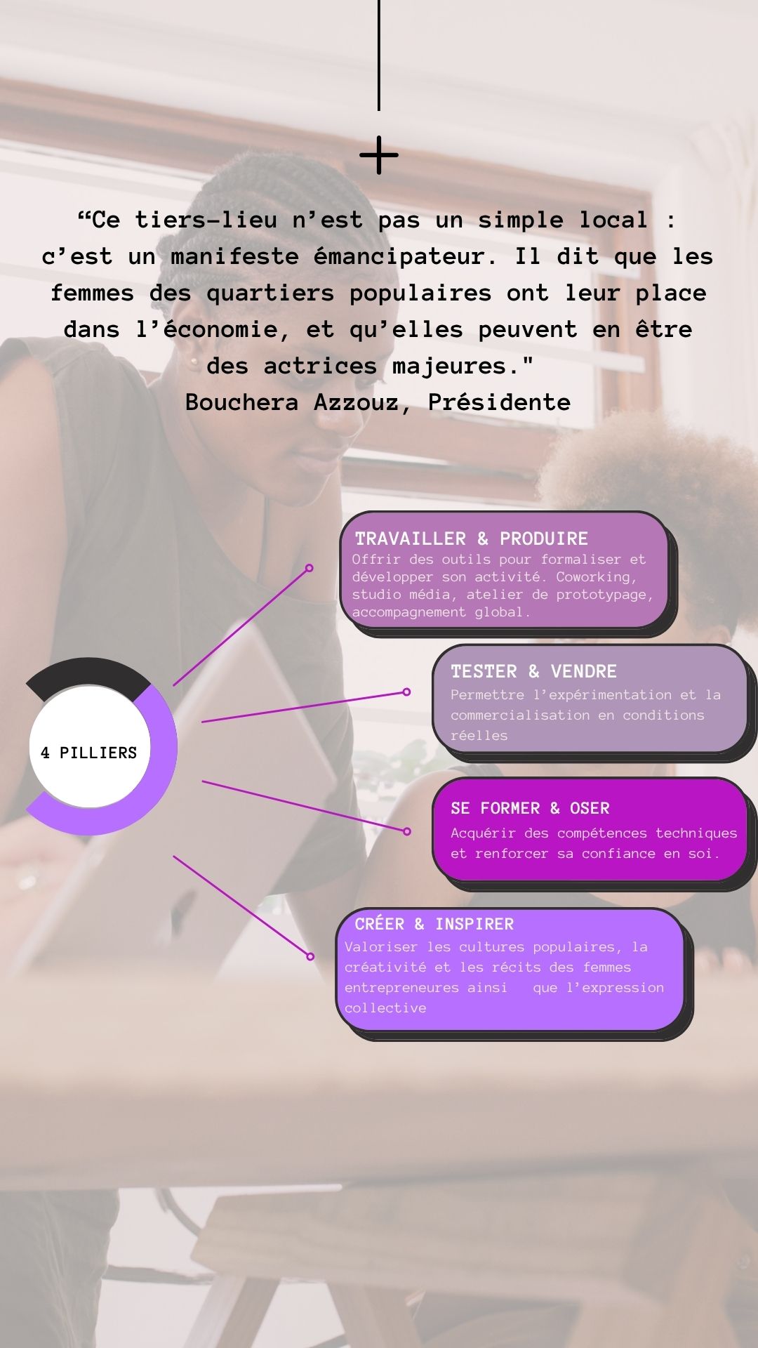Situé au cœur d’un quartier revitalisé, lauréat du concours "Inventons la Métropole du Grand Paris Horizon 2030 - IMGP1", cet espace sera un véritable centre de ressources et de développement. Il aura pour mission de favoriser l’épanouissement des femmes en mettant l'accent sur l'entrepreneuriat et l'employabilité à travers une gamme diversifiée de programmes.